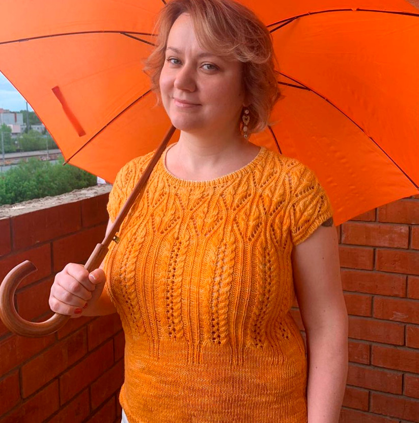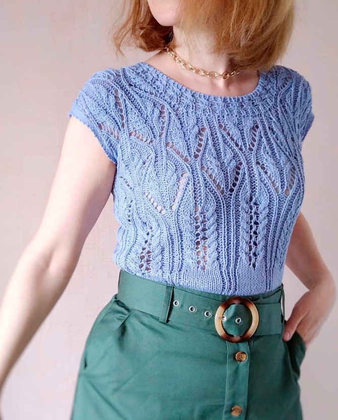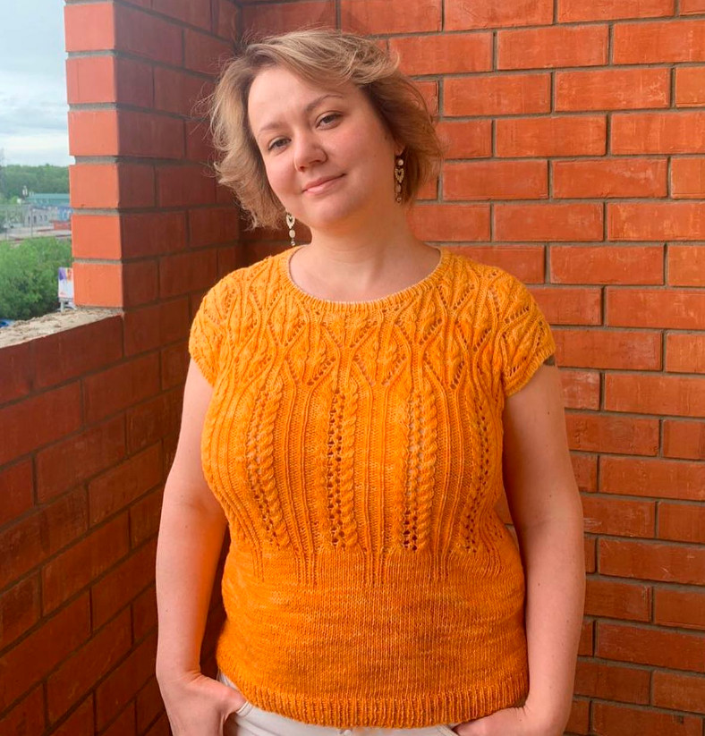 Топ связан из Drops Safran (100% хлопок, 160м/50гр), расход – 3 моточка, спицы №3.