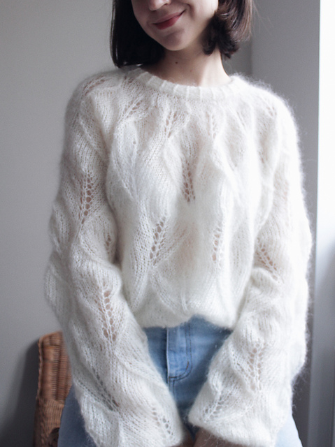 Yarn: The sweater is knitted from Drops Kid Silk yarn (kid mohair 70%, silk 30%), 210 meters/25 g, in two strands. But any yarn with the same composition and yardage will suit, for example: Lana Grossa SilkHair, BBB Soft dream, Lana Gatto Silk Mohair, Infinity Silk Mohair, Mohair by Canard Brushed Lace and others.