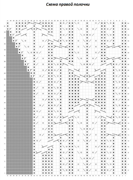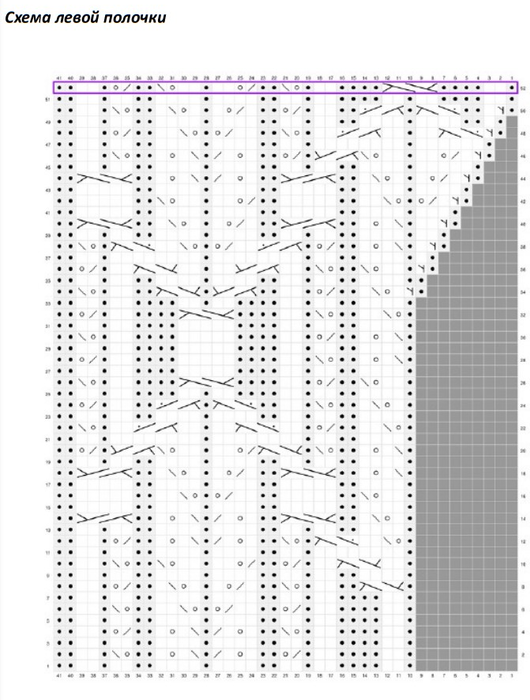 Затем наберите 17 пет., с помощью обратных петель или набора косичной. Верните отложенные петли левого плеча на спицы, и вяжите ряд 52 Схемы левой полочки, перенесите маркер, лиц. до конца.