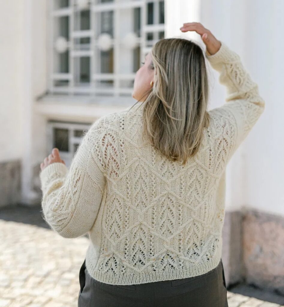 Образец на фото: 3 (3, 4, 4, 4) (5, 5, 5, 6) мотков Tôt Le Matin Tot Single Sock (100% меринос; 366 м / 400 ярдов на 100 г) в цвете Champagne и 5 (5, 5, 6, 6) (7, 8, 8, 9) мотков Knitting for Olive Soft Silk Mohair (70% мохер, 30% шелк; 225 м / 246 ярдов на 25 г) в цвете Elderflower.