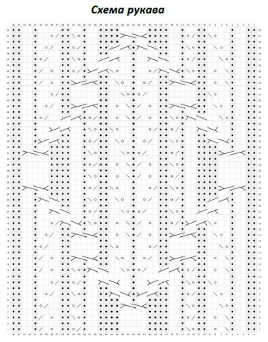След. круг. ряд: Продолжайте вязать по кругу (обратите внимание, что все ряды схемы теперь вяжутся справа налево). Лиц. до след. маркера и одновременно провяжите оставшиеся двойные петли как лицевые. Перенесите маркер, вяжите след. ряд Схемы рукава, перенесите маркер, лиц. до конца.