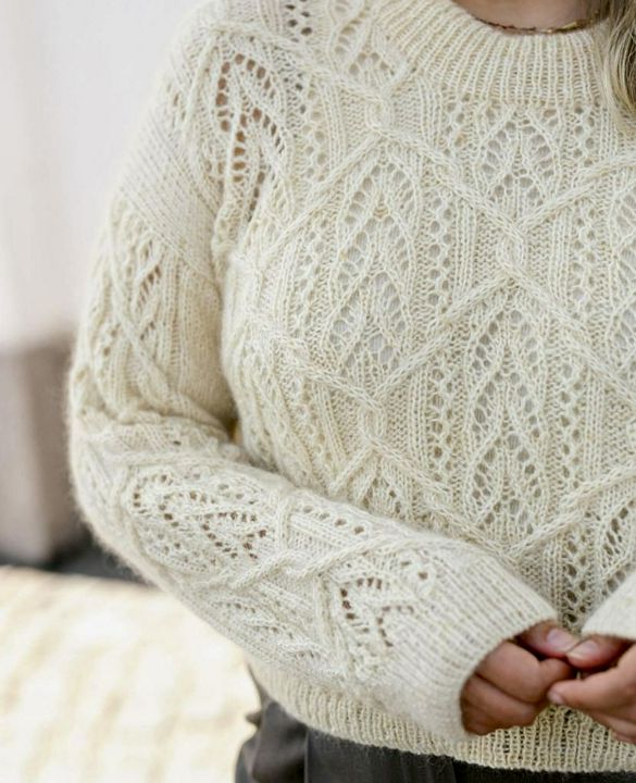 В конце планка горловины складывается вдвое. Для того, чтобы узоры лучше читались, я рекомендую выбирать однотонные или слегка тональные цветовые решения. Пуловер Champagne вяжется с использованием одной нити пряжи fingering weight вместе с нитью мохера на шелке, но вы также можете связать его, используя одну нить пряжи DK weight.
