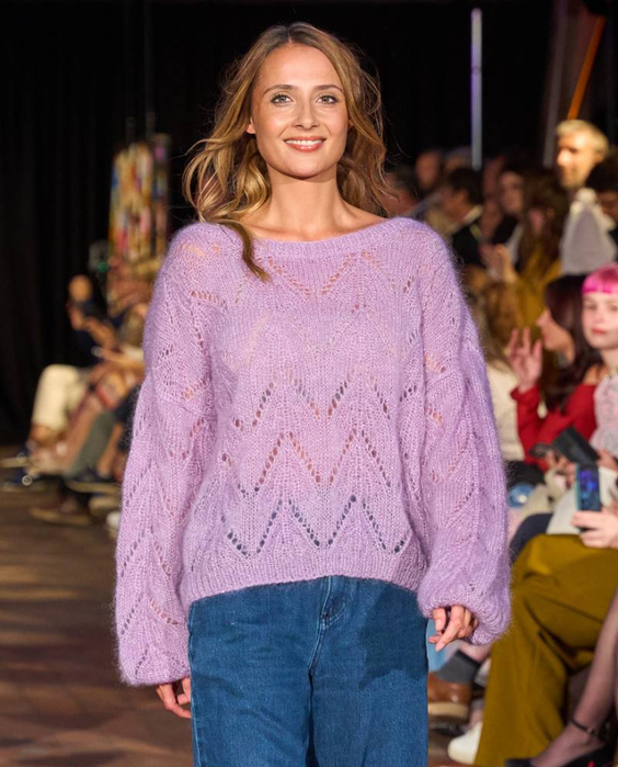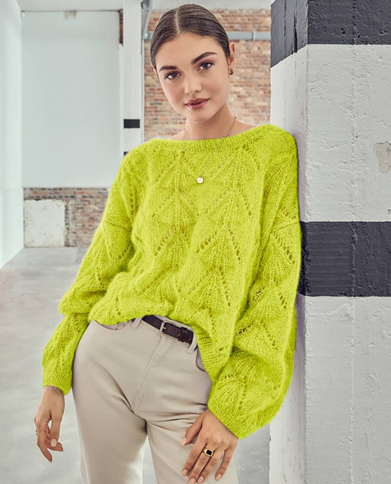 На спицы No 4,5 двойной нитью набрать 97 (101:109:117:127) п. и вязать 4 см резинкой. Перейти на спицы No 5 и продолжить вязать лицевой гладью и фантазийным узором согласно схеме, прибавив в начале 1-гор. 1 п. и распределив петли следующим образом: 1 (3:7:2:7) п. лицевой гладью, 96 (96:96:114; 114) п. фантазийным узором и 1 (3:7:2:7) п. лицевой гладью 98 (102:110:118:128) п.