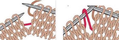 Ввести левую спицу под протяжку между петлями движением спицы от себя, и провязать петлю лицевой за заднюю стенку. На видео до 1:15