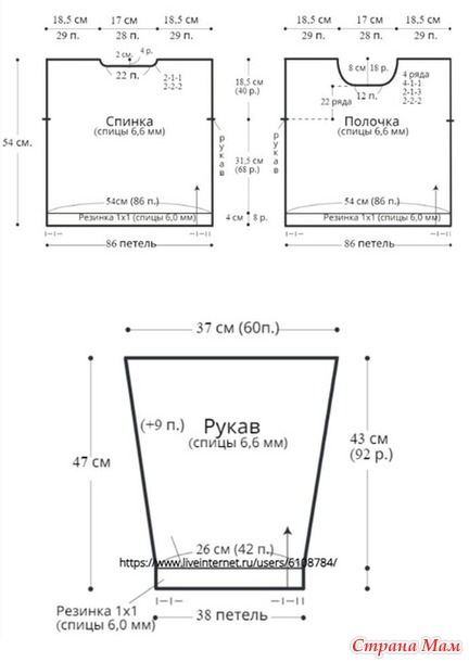 1. Спицы прямые диаметром 6,6 мм (основной узор), 6,0 мм (резинка);