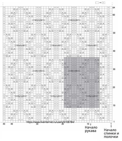 3. Вязание спинки и полочки начинается с 1-ой петли 1-го ряда схемы, рукава начинайте вязать с 9-ой петли 1-го ряда схемы.