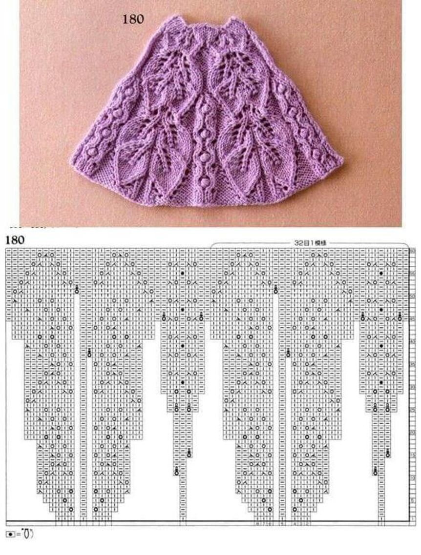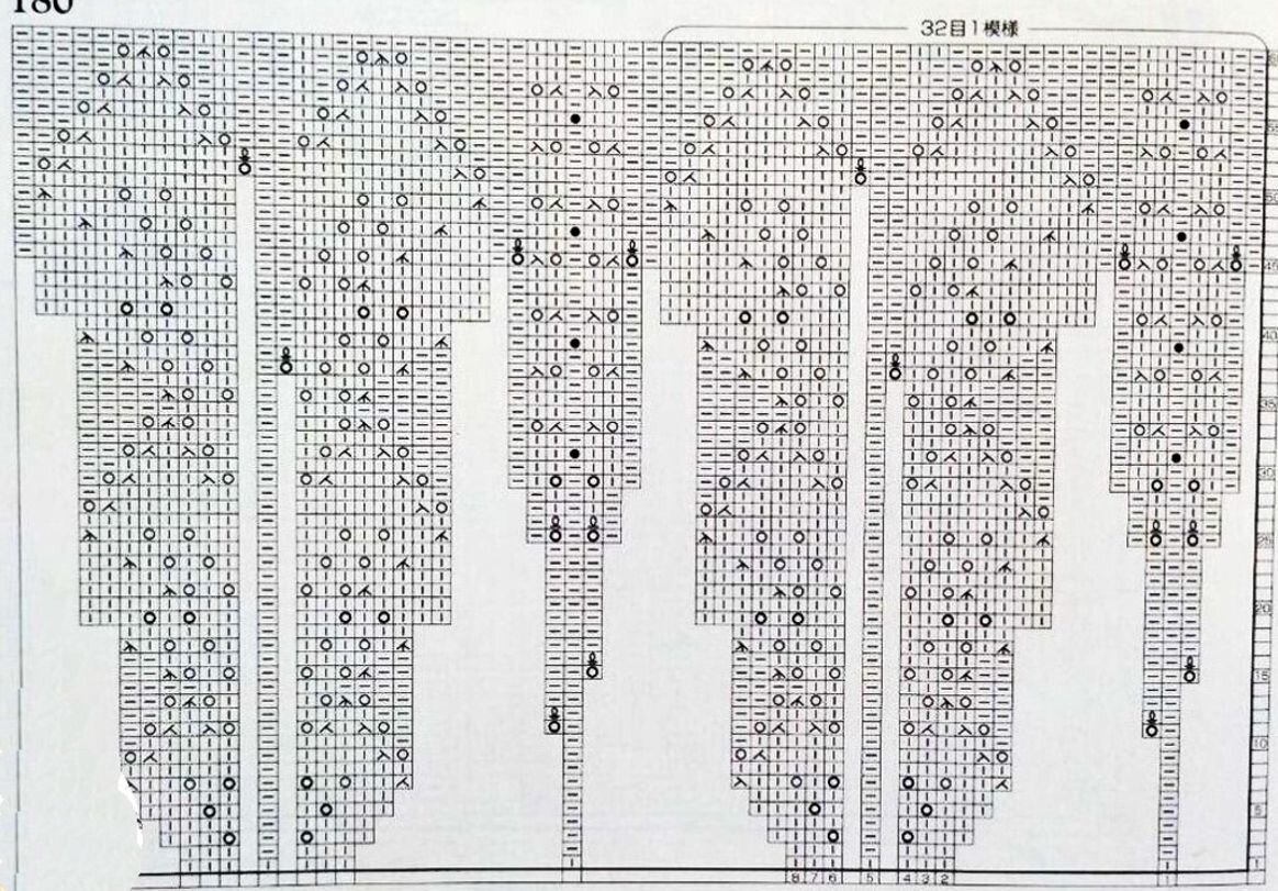 В ширину повторяем раппорт узора 10 раз. Вяжем в высоту по схеме 58 рядов, формируя кокетку. Когда кокетка связана, на спицах должно быть 320 петель. Начало круга - это центр спинки.