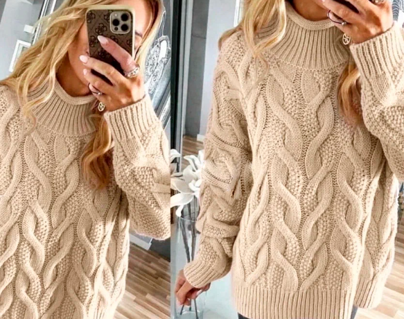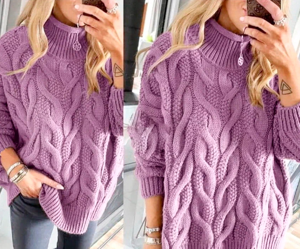 Выполнить плечевые швы. Для ворота поднять по краю горловины на круговые спицы петли и вязать воротник на высоту 18 см резинкой 1х1. И далее 6 рядов лицевой гладью. Закрыть петли свободно.
