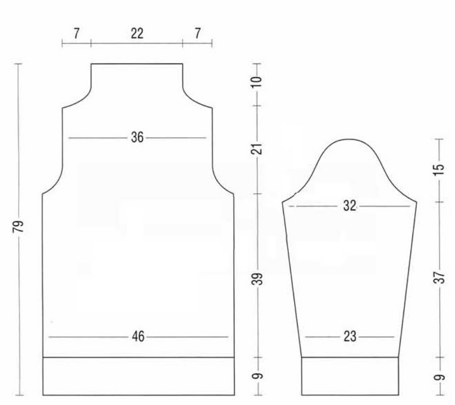 Для бокового скоса прибавить с обеих сторон в каждом 10-м р. 8 х 1 п. = 60 п. Окат рукава: через 46 см от начального ряда закрыть в каждом 2-м р. 2 х 2 п. и убавить 4 х 1 п., убавить в каждом 4-м р. 3 х 1 п., затем убавить в каждом 2-м р. 5 х 1 п. и закрыть 1 х 2 п. и 2 х 3 п.