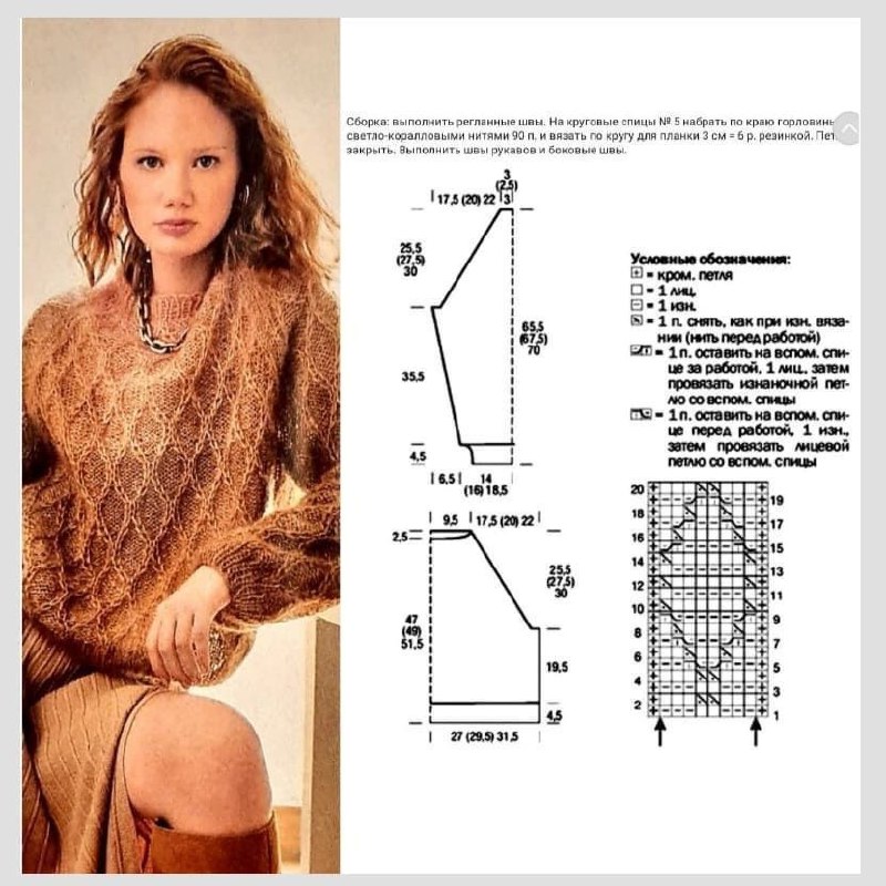 Вам потребуется: пряжа (70% мохера, 30% шелка; 200 м/25 г)- 200 (225) 250 г карамельно-коричневой и 75 (75) 100г светло- коралловой; спицы № 5 и 6; круговые спицы № 5.