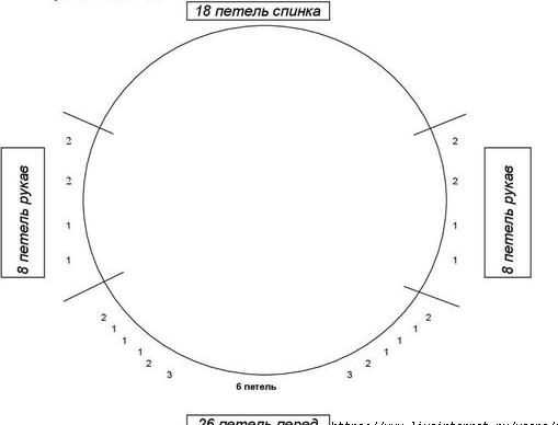От рукавов отнимаем по 2 петли и прибавляем к переду и спинке