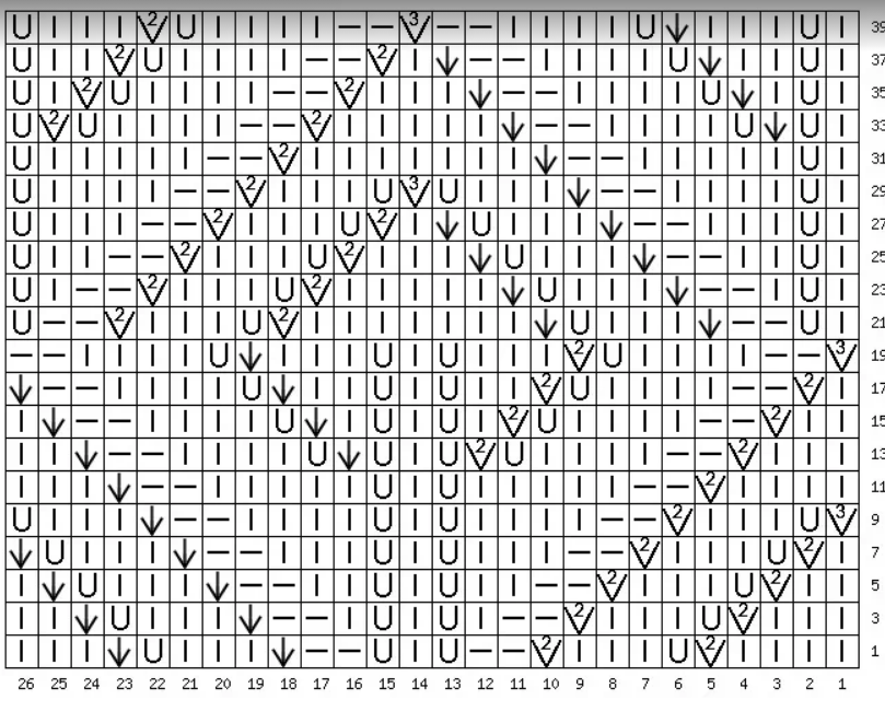 Раппорт узора — 26 петель в ширину и 40 петель в высоту.