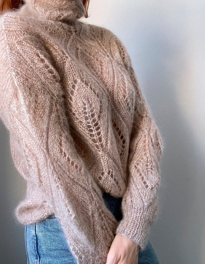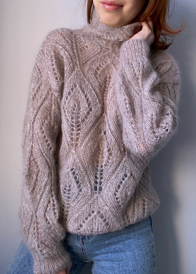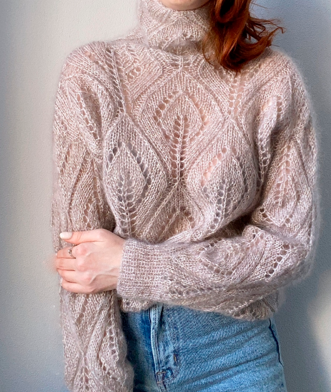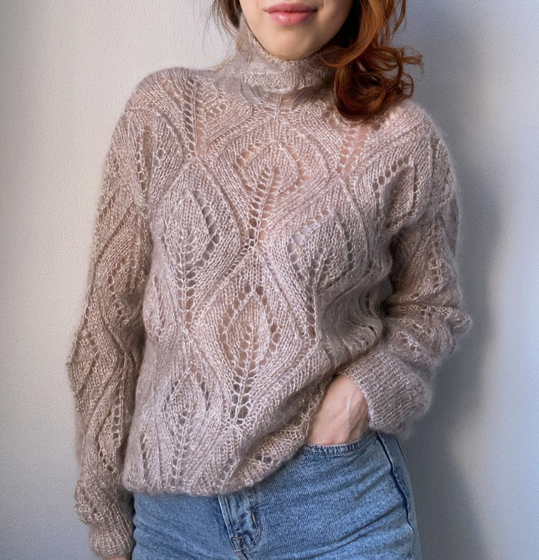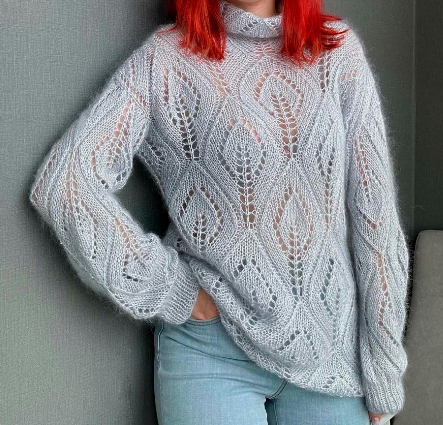 По описанию свитер связан в 3 нити — мохер на шелке Cielo (25 гр / 212 м) в 2 нити и Lurex Lame 550 (25 гр / 550 м) в 1 нить.