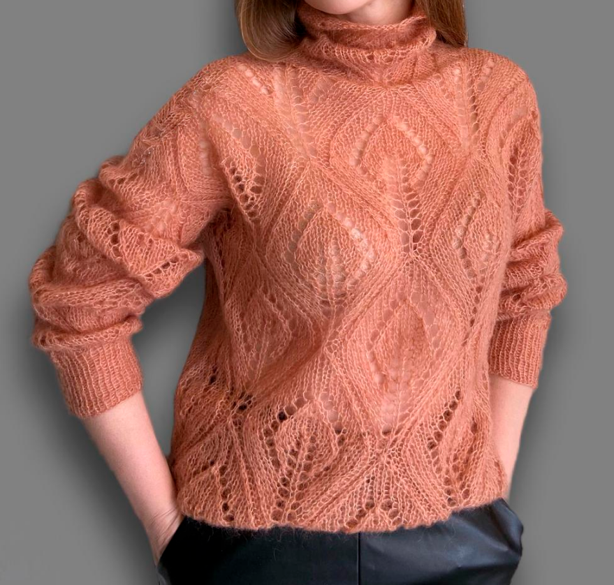 26 петель узором «Листья» (с 1 ряда), далее 44 лиц.По описанию связано в высоту 1 раппорт узора.