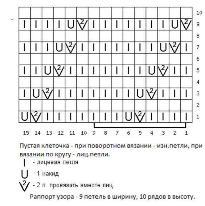 - Раппорт узора - 9 петель в ширину, 10 рядов в высоту