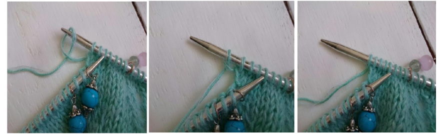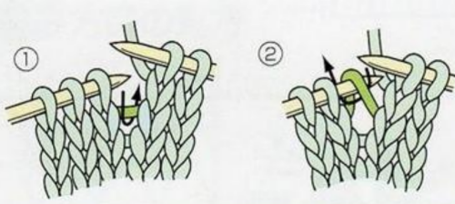 накинуть петлю на левую спицу из протяжки и провязать ее лицевой (за заднюю