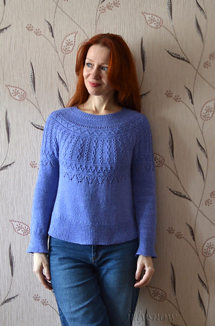 The neck and yoke are worked in the round with circular needle, from mid back and top down. You can work an elevation at the back if you wish. The yoke is divided for body and sleeves and the body is continued in the round with circular needle as far as the split in each side, then each piece is finished separately back and forth with circular needle. The sleeves are worked in the round with circular needle/double pointed needles.
