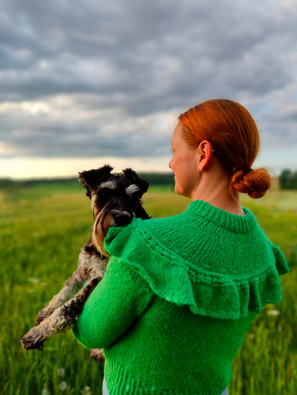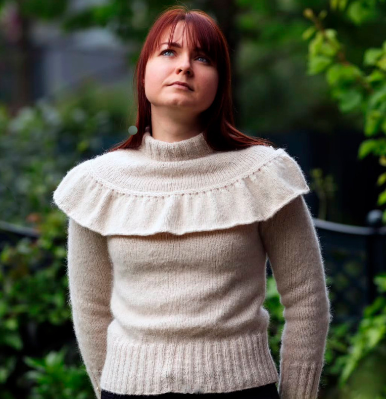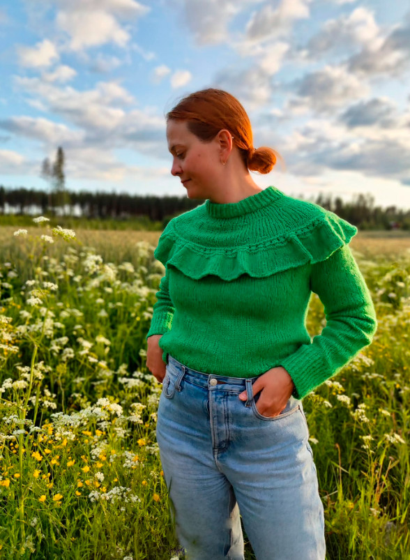 Worked in the round on circular needle, top down. Work double neck edge and yoke in the round on circular needle from mid back, top down. Increase stitches on yoke. Now divide yoke for body and sleeves. Work the body in the round on circular needle, work sleeves in the round on a double pointed needles / short circular needle. Work a flounce that are sewn to the yoke at the end.