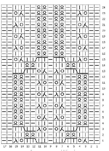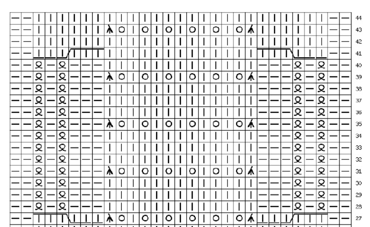 1-й лиц. р.: 1 кром., 34 п. узора «Двойной рис», 2 вместе изн., 8 п. узора «Планка слева».