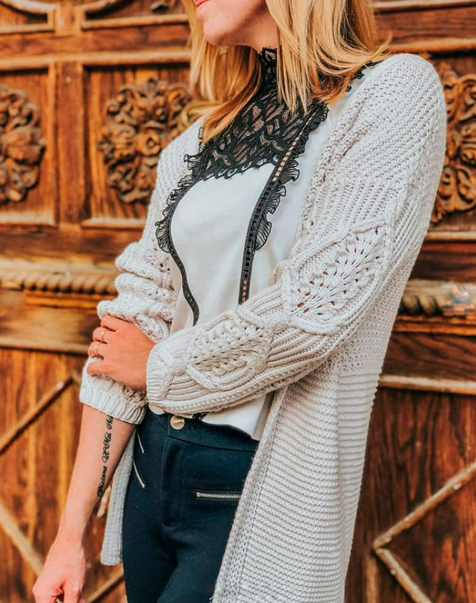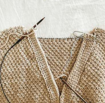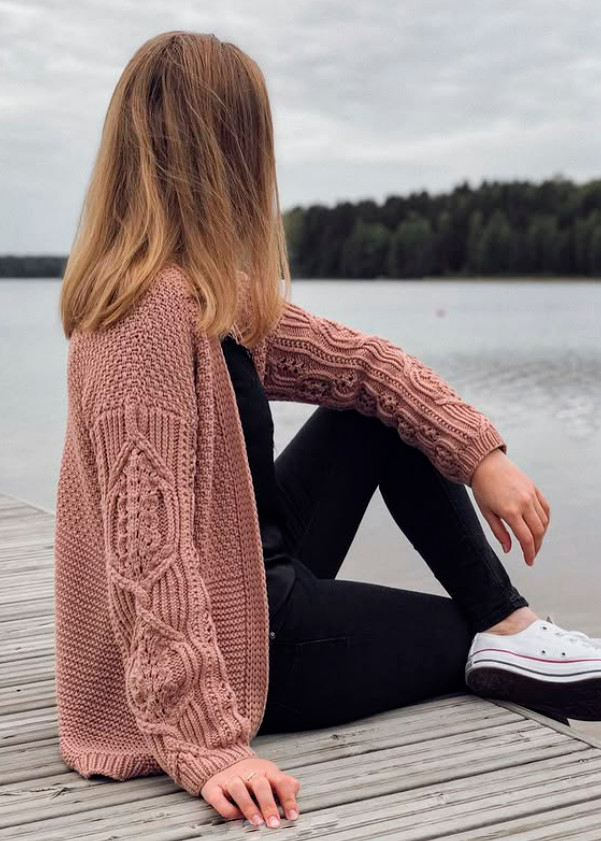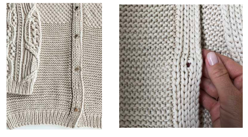 Открытые петли рукавов можно соединить с проймами кардигана также трикотажным швом.