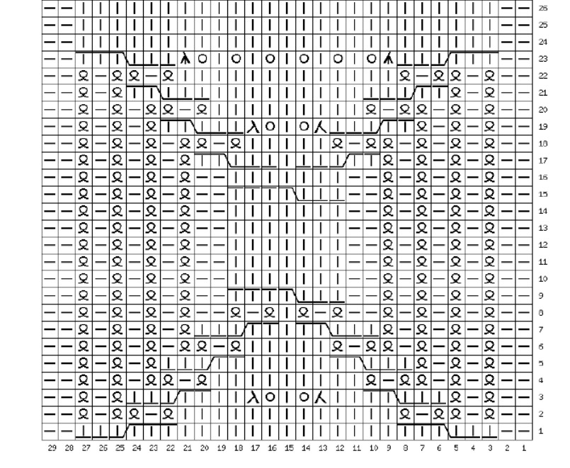 • Символ = 4 петли, перекрещенные вправо: снять 2 петли на вспом. спицу за работой, провязать 2 лиц., затем 2 со вспом. спицы.