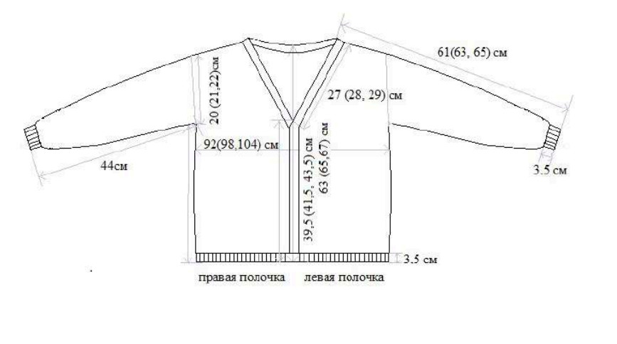 Вязать далее прямо поворотными рядами узорами, последовательность которых указана выше, до высоты 28 (30, 32) см или 76 (78, 82) рядов, не считая резинки.