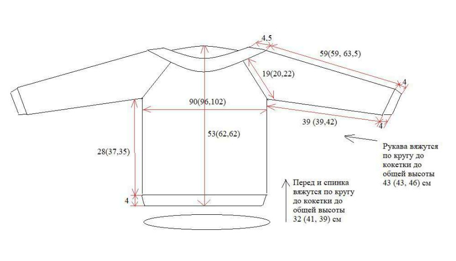 Перед со спинкой и рукава свитера вяжутся раздельно круговыми рядами, а затем соединяются и вяжется кокетка на круговых спицах до завершения изделия.
