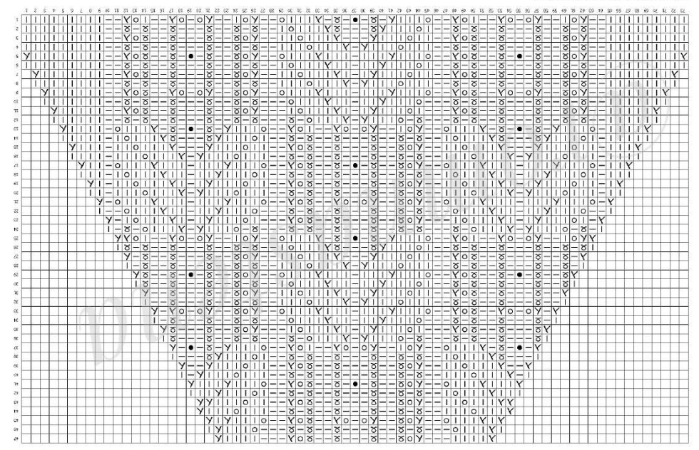 10-ый круг.р.: 2 изн.п., 1 лиц.скрещенная п., 1 изн.п., 1 лиц.скрещенная п., 2 изн.п., 1 лиц.скрещенная п., 3 изн.п., 1 лиц.скрещенная п., 2 изн.п., 1 лиц.скрещенная п., 1 изн.п., 1 лиц.скрещенная п., 3 изн.п., 1 накид, 3 лиц.п., 2 вместе лиц.п. с наклоном влево, 2 лиц.п., 1 изн.п., 2 лиц.п., 2 вместе лиц.п. с наклоном вправо, 3 лиц.п., 1 накид, 3 изн.п., 1 лиц.скрещенная п., 1 изн.п., 1 лиц.скрещенная п., 2 изн.п., 1 лиц.скрещенная п., 3 изн.п., 1 лиц.скрещенная п., 2 изн.п., 1 лиц.скрещенная п., 1 изн.п., 1 лиц.скрещенная п., 2 изн.п.