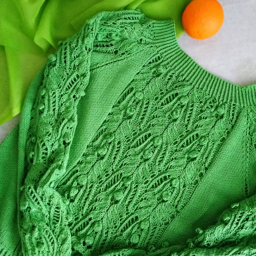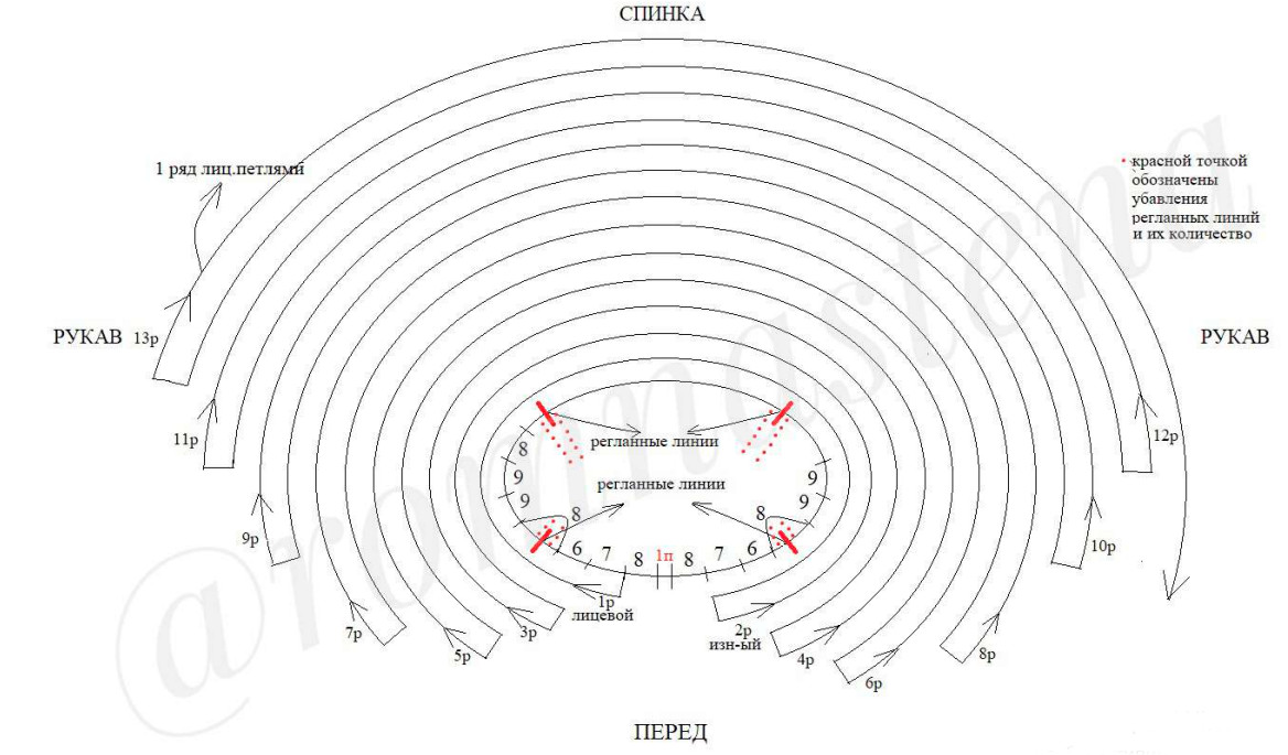 В этом же лицевом ряду дополнительно провяжите один раз все убавления для реглана по всем четырём регланным линиям.