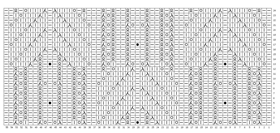 Узор «Ажурный» (Раппорт состоит из 55 петель и 24 рядов; ряды указаны только лицевые для кругового вязания)