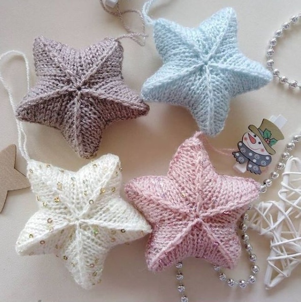 Assembly: fold the piece along both knit lines of the fold and sew the cast-on edge to the closed edge at the top. Starting from the gathered edge, perform a longitudinal seam on the bells, stuffing with tweezers. Then gather the upper edge onto a thread, tighten and secure. Pull one of the 3 strands from a piece of chocolate yarn, and use this thread to embroider a cross on the lower part of each bell. Sew one bell in the center of the collar, and one more bell 8 stitches away on each side from the center. Wrap the collar around the neck and sew the edges together. Attach the collar to the deer behind the neck with a few stitches.