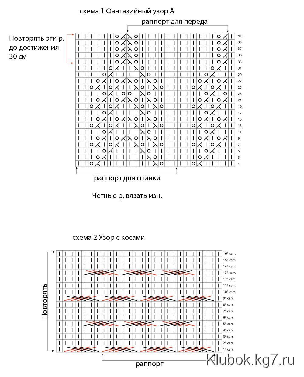 Правая полочка: на спицы №4 набрать 64 п. и вязать 4 р. платочной вязкой. Перейти на вязание фантазийным узором А по схеме 1, повторяя раппорт для полочек и провязывая первые 7 п. платочной вязкой для формирования планки. На высоте 30 см от начала вязания перейти на вязание узором с косами по схеме 2. На высоте 32 см от начала вязания вывязать первое отверстие для пуговицы на расстоянии 4 п. от края, второе - на расстоянии 9 см от первой. 3-е и четвертое отверстия не вывязывать, а сделать, раздвинув петли узора. На высоте 42 см от начала вязания перейти на вязание фантазийным узором В, прибавив с левой стороны в каждом 2-м р. 4 раза по 1 п. На высоте 63 см от начала вязания для выреза горловины закрыть с правой стороны в каждом 2-м р. 1 раз 8 п., 1 раз 4 п., 3 раза по 3 п., 1 раз 2 п. и 8 раз по 1 п. На высоте 30 см от начала вязания фантазийным узором В все п. закрыть.