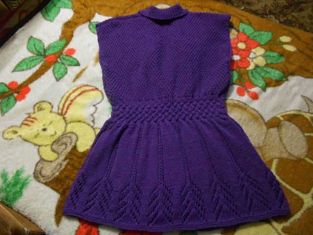 Ажурная фиолетовая туника связана спицами из полушерстяной пряжи двумя фантазийными узорами и стягивающим узором с косой на линии талии.
