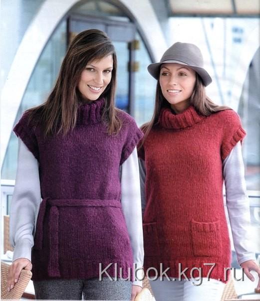Knit with maroon yarn similarly to the sleeveless vest with pockets. For the belt on needles #4.5 cast on 7 sts, knit 110(115)120(130)135(140) cm in ribbing 1x1, bind off the stitches.
