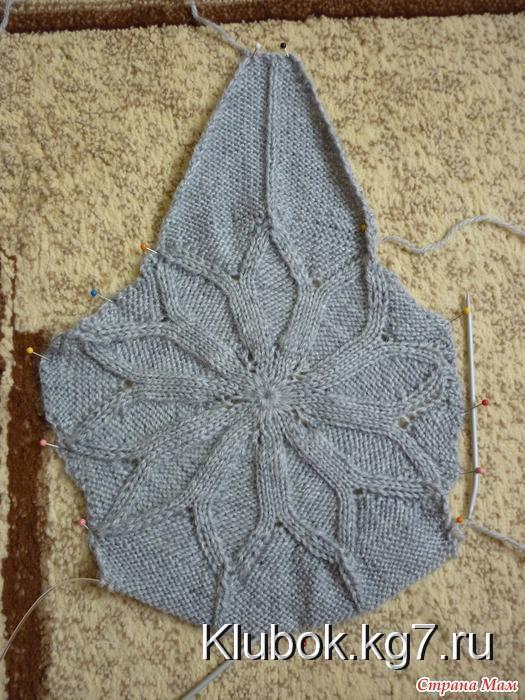30 ряд начинаем закрывать - убавлять в такой последовательности. 1ый промежуток закрываем петли сразу, второй промежуток вяжем 3-4 ряда убавляя по 1 петле с каждой стороны на 5-ом ряде закрываем. 3 промежуток закрываем сразу 4-5промежутки вяжем убавляя с каждой стороны по 1петельке, при этом не забываем оставить полосочку в центре из лицевых петель