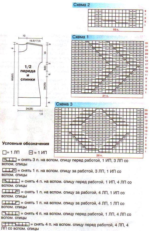 Перед: Набрать петли и вязать, как спинку, но на высоте 60 (62) см от начала закрыть 22 центральные п. для горловины, затем с обеих сторон от них 1 раз по 3 п., 1 раз по 2 п. и 6 раз по 1 п. в каждом 2-м р. Плечевой скос слева выполнить уже на высоте рукава 18 см от начала, в справа выполнить плечевой скос, как на спинке, на высоте 19 см. [cut