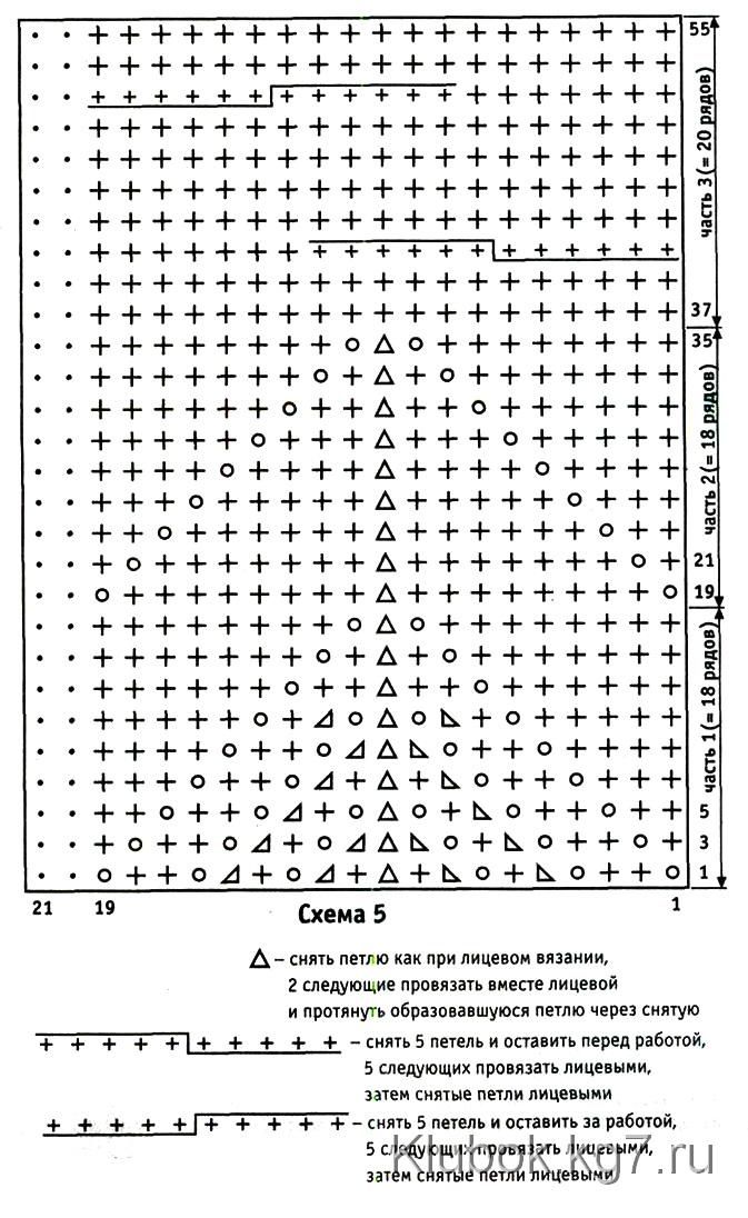 п. и вязать 2 ряда изнаночными петлями, продолжить узором по схеме 5: кром., 4