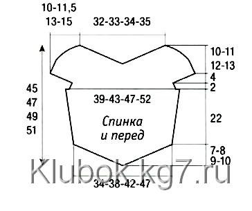 Спинка/перед:набрать 91/101/111/ 123 п. и вязать ажурным узором. В 5-м р. и в каждом 4-м р. на средних 3 п. выполнять 1 дв. протяжку (снять 2 п. как лиц., 1 лиц. и протянуть её через снятые петли), в то же время прибавлять с обеих сторон на расстоянии 1 п. от края * в каждом 4-м р. 1 х 1 п.,