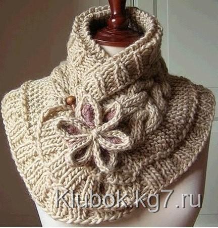 Нечетные ряды вяжем как 17 ряд, четные ряды вяжем как 18 ряд, в каждом 10 лицевом ряду делаем как 22 ряд, продолжаем вязать такую длину, какую вам нужно, заканчивать шарф точно так же, только вместо прибавления петель, делать убавление (2 петли вместе). Когда свяжете всю длину шарфа, по краю вкруговую набираем резинку 2 лиц., 2 изн. (следите чтобы резинка у вас замкнулась) на скосах делаем по 1 накиду, и вяжем от 7 до 10 рядов по желанию. Все петли закрываем. Вяжем цветочек какой вам больше приглянулся.