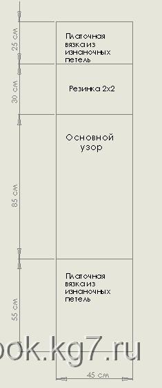 1. Набрать 102 петли и связать 55 см. платочной вязкой. Далее вязать основным узором 85 см, резинкой 2х2 - 30см, платочной вязкой - 25 см. Все петли закрыть в один ряд.