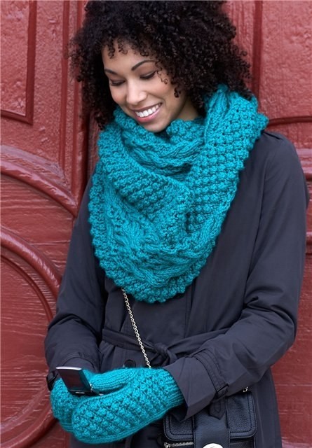 МАТЕРИАЛЫ: Варежки BERNAT SOFTEE ТОЛСТ. ( 100G/3.5OZ ) 39200 Emerald 1 клубк. Размеры 4.5 мм ( U.S. 7 ) и 5 мм ( U.S. 8 ) спиц. размера, необходимого для получения правильной плотности вязания Плотность вязания. Cowl BERNAT SOFTEE ТОЛСТ. ( 100G/3.5OZ ) 39200 Emerald 3 клубк. Размер 6.5 мм спиц. размера, необходимого для получения правильной плотности вязания Плотность вязания. Дополнительн. спиц..