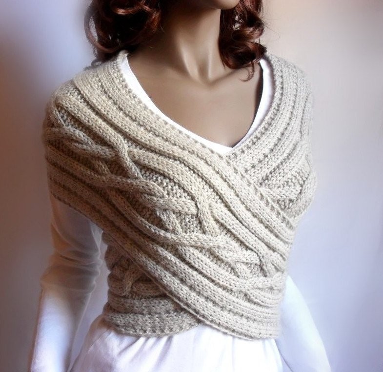 Как правило, подобные модели не требуют выкройки. Размер зависит только от вашего желания. Узор также подойдет любой. Даже простейшая «платочная» вязка при выборе пушистой пряжи, вроде «техно» или «кролика» позволит вам создать уникальную вещь.