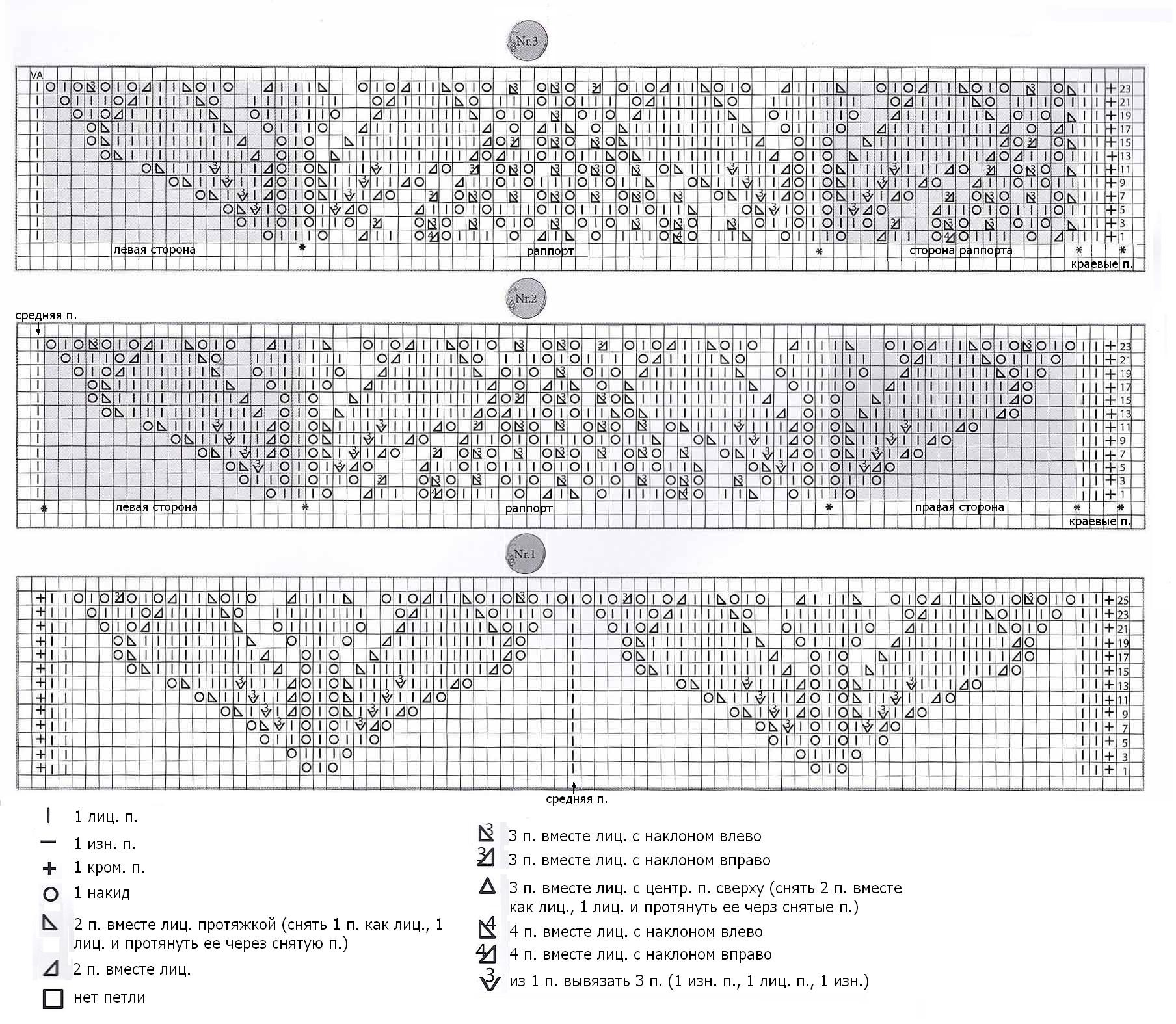 4. Провязать 24 р. согласно схеме № 3 след. образом: 3 краевые п. + 1 лиц. п. + сторона раппорта + раппорт + раппорт + левая сторона + 1 средняя п. + правая сторона (схема №2) + раппорт + раппорт + 1 лиц. п. + сторона раппорта (в зеркальном отражении) + 1 лиц. п. + 3 краевые п. (2 лиц. п. + 1 кром.)