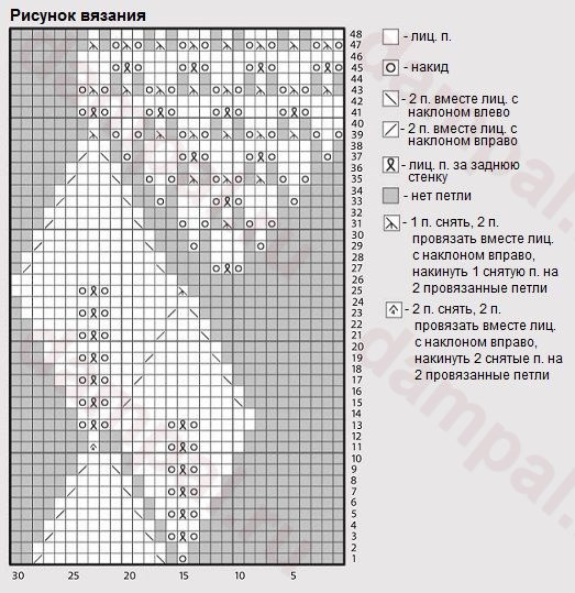 Далее вязать ажурный рисунок по схеме, повторяя раппорт 8 (9, 10) раз в одном ряду.