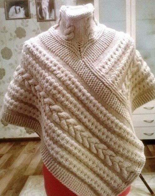 Женское пончо вяжется спицами из меланжевой пряжи узором из кос. В нём вы будете выглядеть очень эффектно. Размер: универсальный Вам потребуется: 500 г пряжи (60% шерсти, 20% шелка, 20% молочный протеин; 98м/100г), спицы № 4,5; 2 застёжки. Описание работы Модель состоит из 2-х прямоугольников размером 40 х 80 см. Наберите 57 петель и провяжите 5 см платочной вязкой. Потом вяжите по схеме 2.