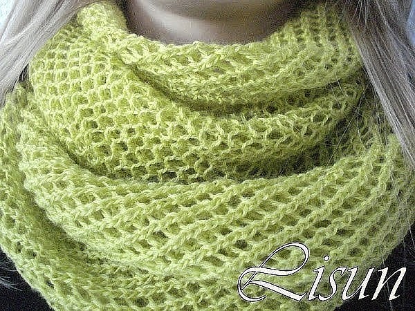 Снуд вязаный спицамиKlubokhttp://klubok.work/1/35/7513/Klubokhttps://klubok.work/css/image/top-logo-en.pngШирина 50 см, длина 120 см. Связан из Семеновской Лидии (шерстьакрил) 1613 м100 г в два сложения, спицы №3. Ушло около 50 г. Узор – обычная сеточка Полный узор сеточки 2 лиц, накид, 2 лиц, накид - 1 ряд накид, 2 лиц, накид, 2 лиц - 3 ряд чётные ряды - изнаночные петли. Цитата с поста автора Набирала 90 петель, вязала прямым полотном, потом замкнула в кольцо. шов практически незаметен, т. к. соединяла по рисунку.
