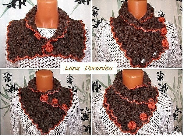 Шарф-шеегрейка.ОписаниеKlubokhttp://klubok.work/1/35/7861/Klubokhttps://klubok.work/css/image/top-logo-en.pngКак видите, сам шарфик простой. А вся фишка в 4 варианта застежки - можно потеплее застегнуться, а можно просто, как воротничок одеть. Схемы готовой нет. Есть описание: Набор 35п + 2кромочные. Распределить петли так: 9п. узор "рис" (1л,1 изн - 2 ряда, потом наоборот 1 изн, 1 лиц - 2ряда), 17 п "Коса", 9п. "рис". Коса состоит из 17п. (8 лиц, 1 изн, 8 лиц). Ну и эти 8 лиц перекрещиваются по 4 п то налево, то направо каждые 8 рядов. Длина шарфа получилась 72 см, ширина 16см. Приложить к шее, что бы не ошибиться с длиной (хотелось, что бы шарф плотно прилегал при определенной застежке). В конце вязания петли закрыть и обвязать эту сторону крючком СБН, а вместо петель для пуговиц - цепочку возд. петель. Далее обвязать шарф по всему периметру "ракушками" из 7СН и эту сторону с петлями для пуговиц тоже, но цеплять "ракушки" за цепочки возд. петель. Затем обвязать весь шарфик оранжевой нитью СБН. и пришить обвязанные пуговицы. Автор Лана Доронина