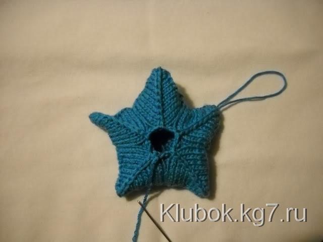 Затяните нить, закрепите. Я вывожу её в вершину луча, натягиваю и обрезаю. Кончик нити прячется в звезду.