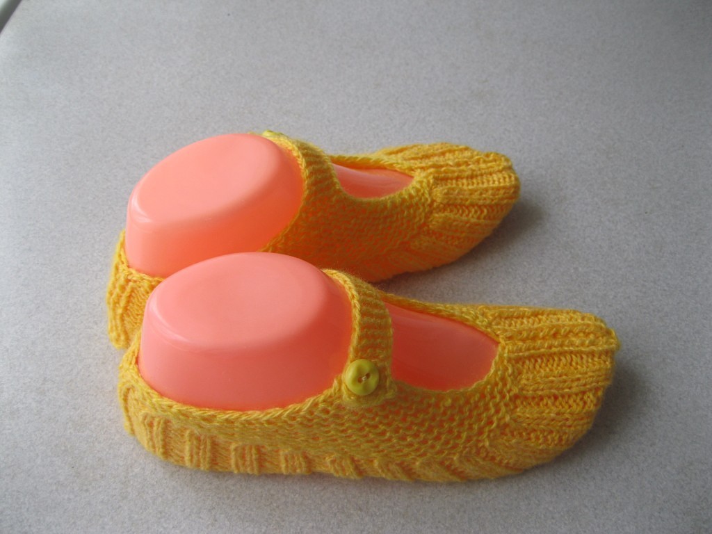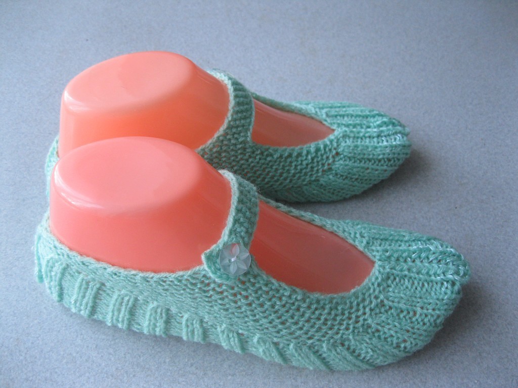 Нужно провязать примерно 30 рядов резинкой,дальше провязываем по две петли вместе где мы их прибавляли,лицевые-лицевой,изнаночные-изнаночной.Теперь переходим на платочную вязку делая убавления в конце и начале ряда (через ряд) пока на спицах не останутся 5 петель.Осталось связать ремешочек необходимой длины,не забудьте сделать отверстие для пуговки,провяжите 2 вместе и сделайте накид,это и будет петелька.Завершительный этап сшиваем тапочек:сложите в двое связанное полотно и зашейте пятку и мысок тапочка,участки вязанные резинкой.Пришейте красивую пуговку,тапочек готов