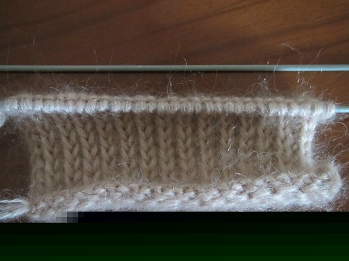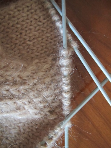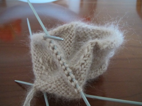 Теперь необходимо набрать петли из противоположных кромочных петель. Таким образом, вязание продолжается уже на 4 спицах, из которых одна рабочая.